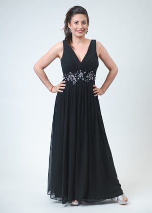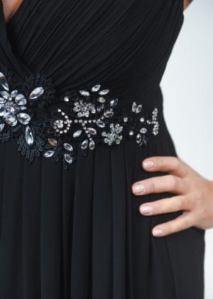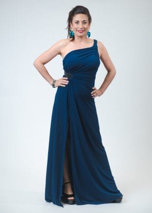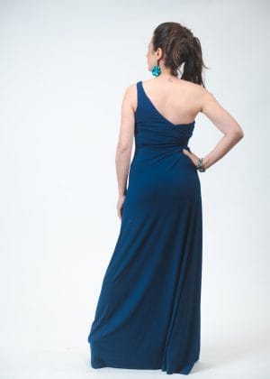 .Alquilá tu vestido largo en satén azul con escote cruzado y manga corta..