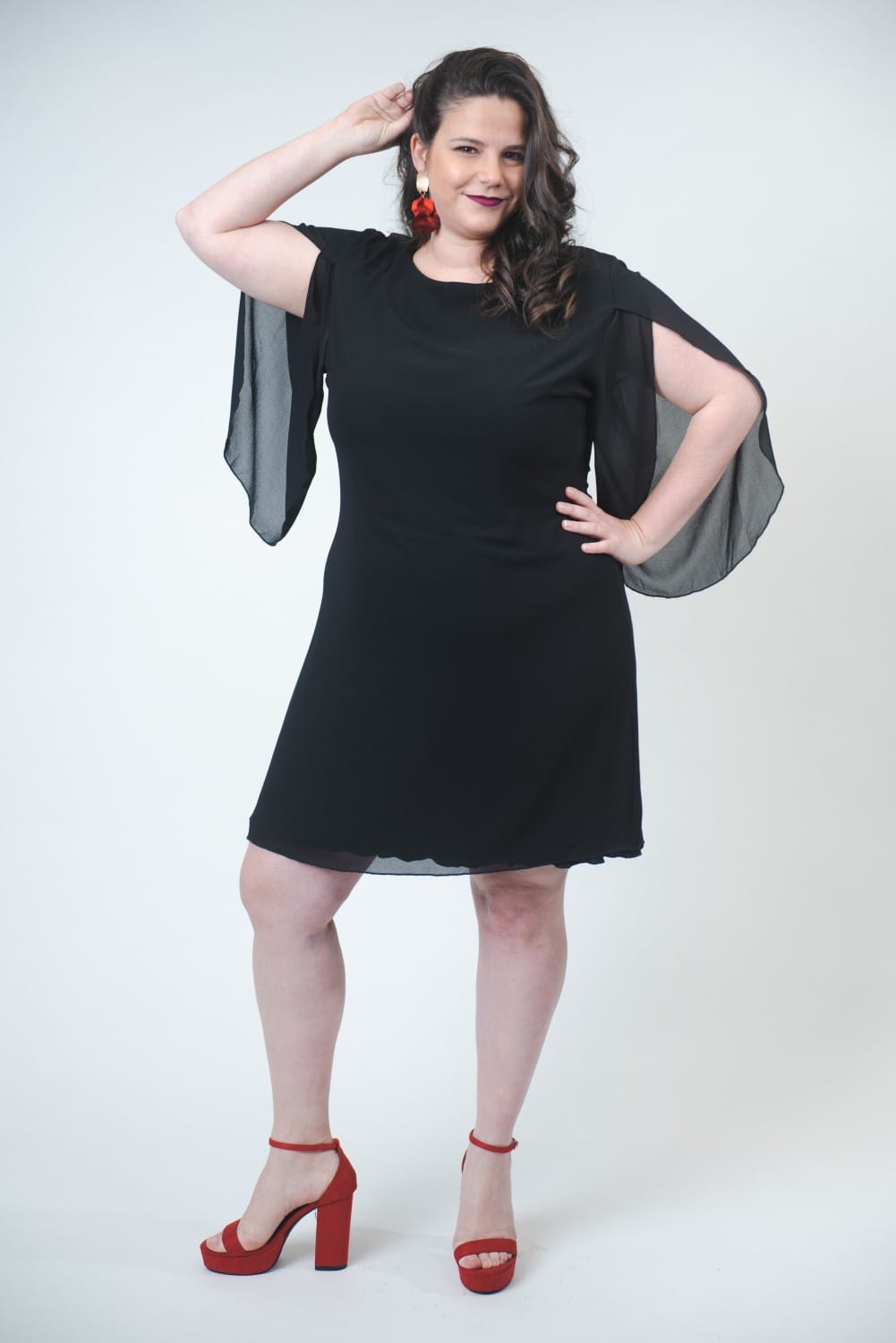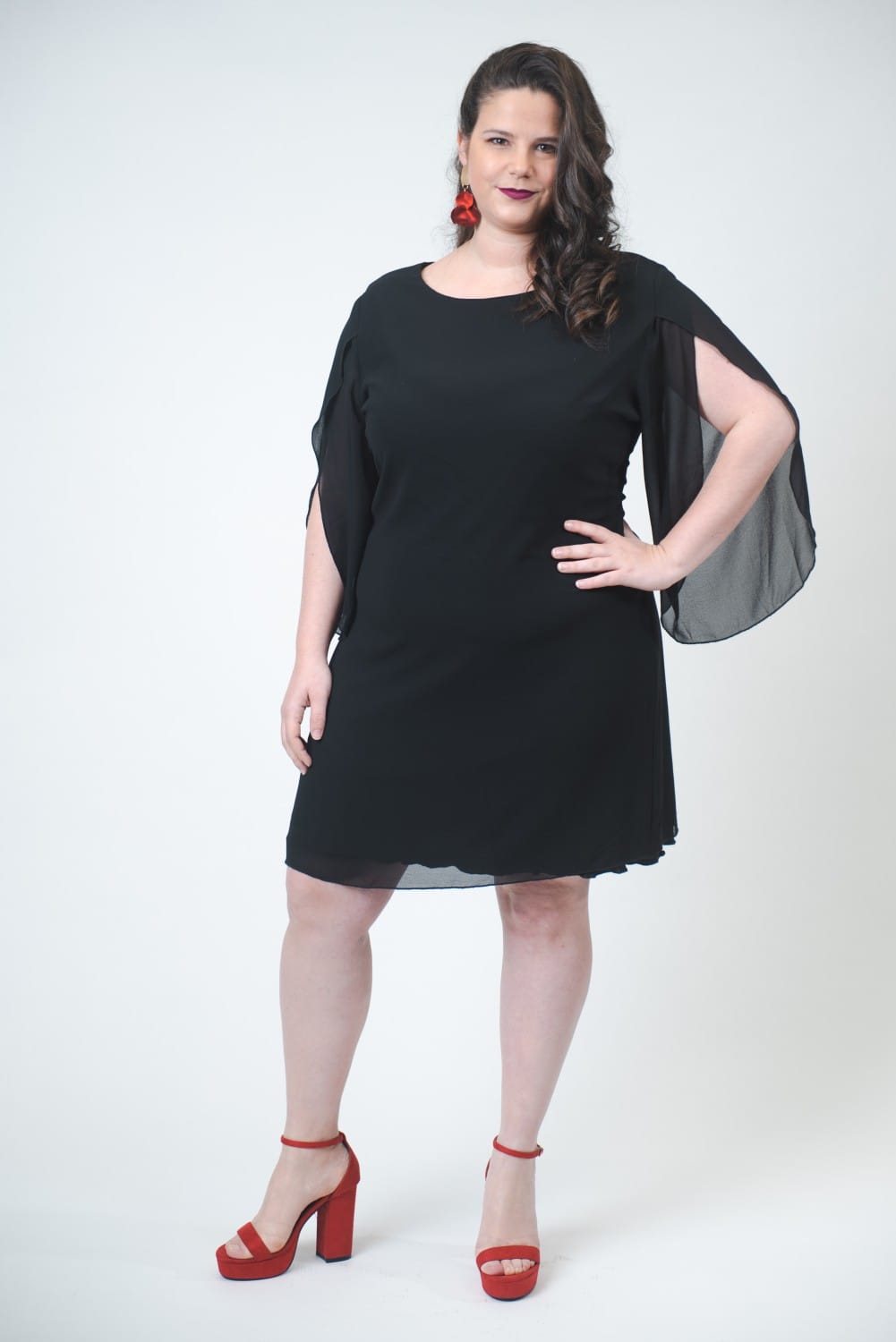 Alquilá tu vestido corto de gaza negra, holgado, con manga larga con aberturas.