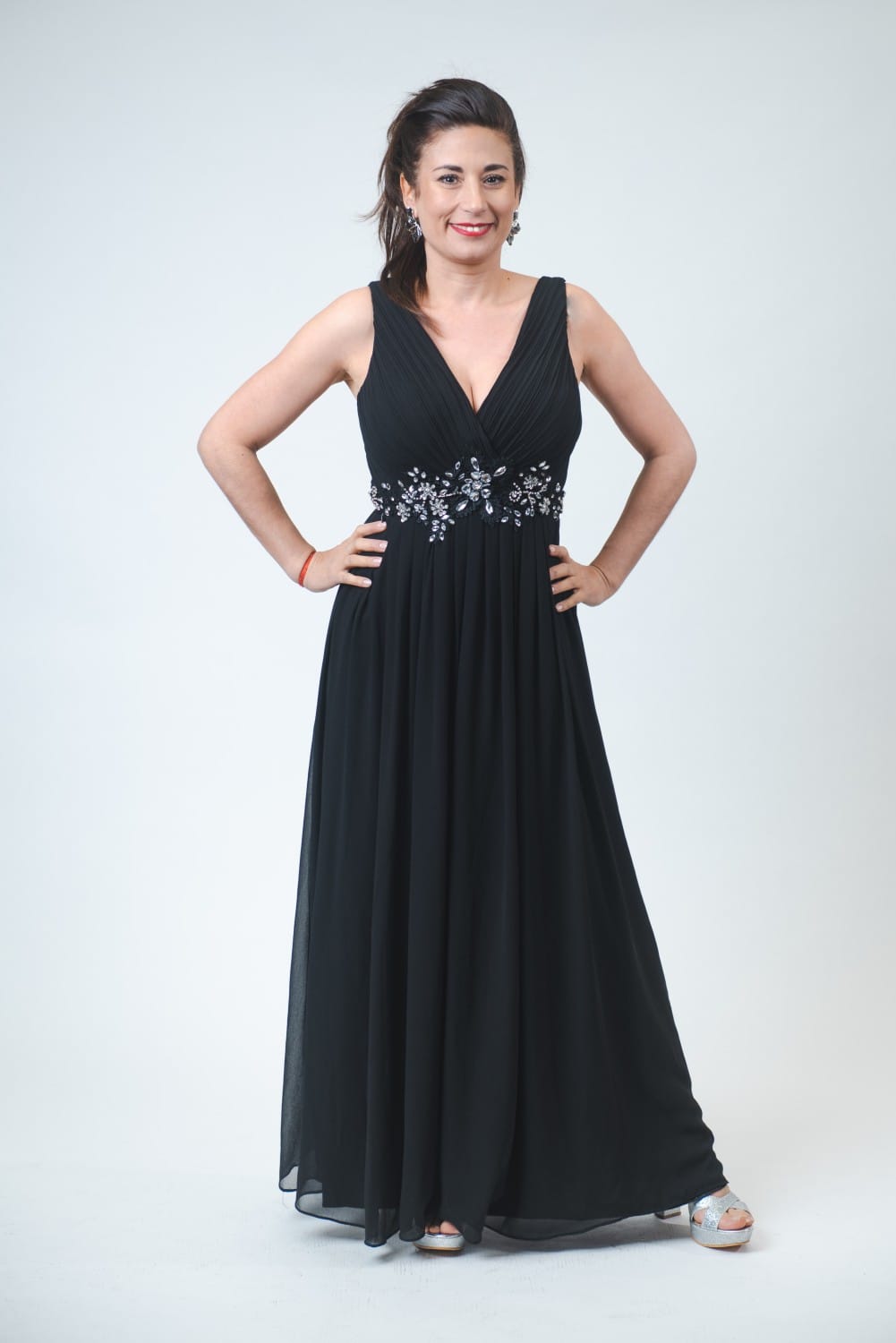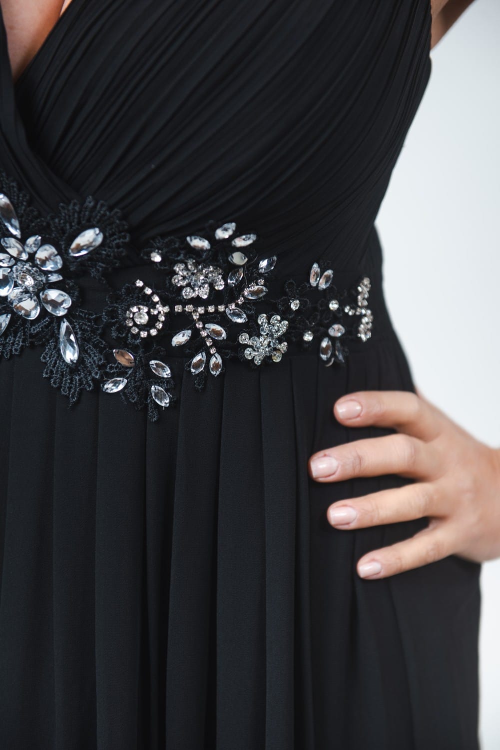 Alquilá tu vestido largo de gaza negra con drapeado superior, escote en V, con bordado en cintura y espalda elastizada.