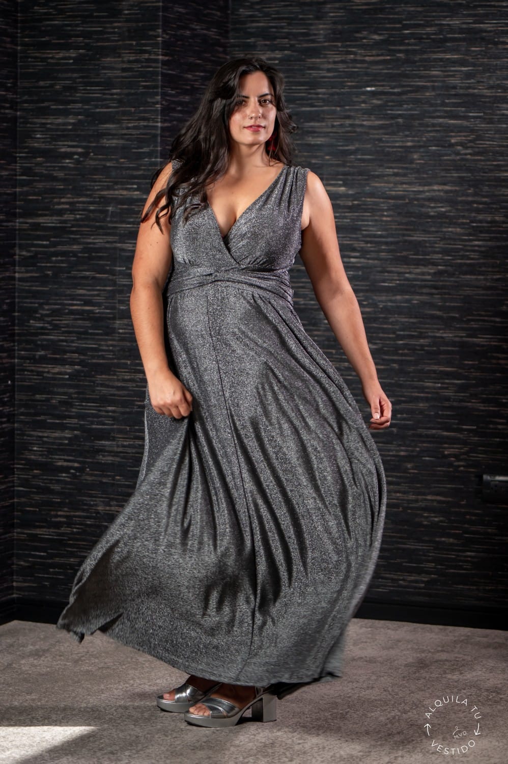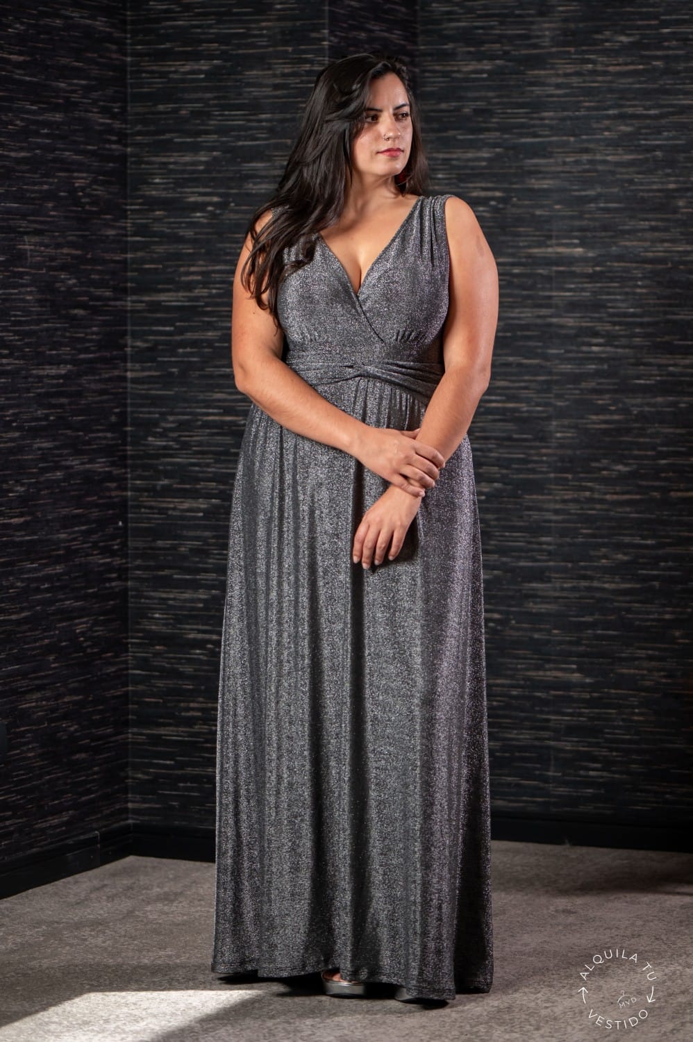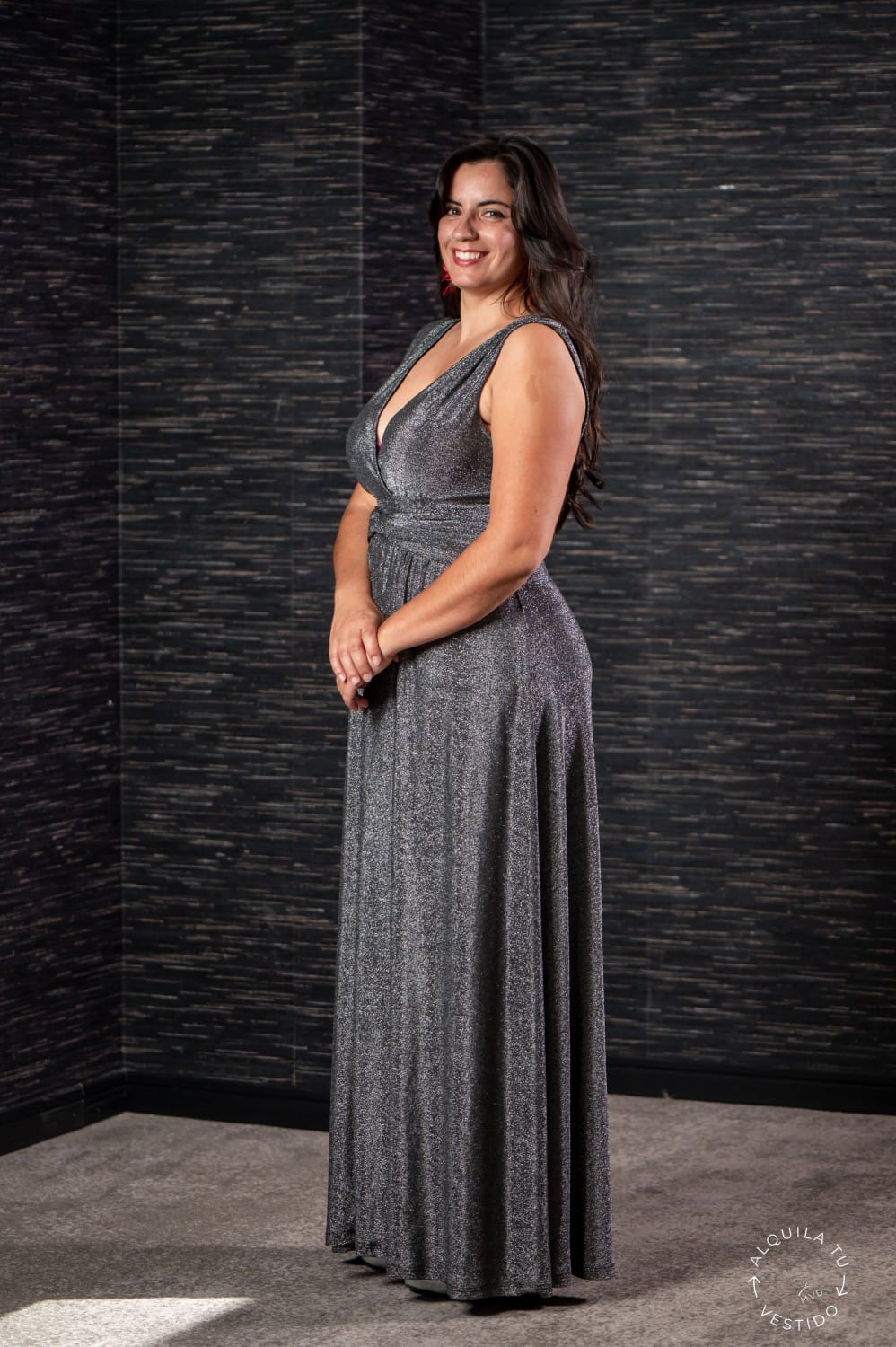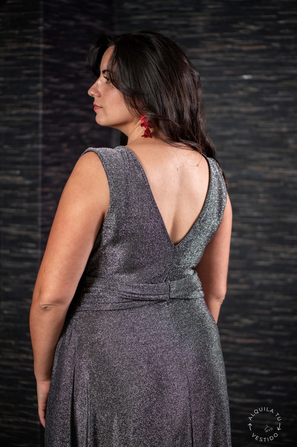 Alquilá tu vestido largo elastizado en glitter gris, con escote profundo y lazo en cintura con nudo.